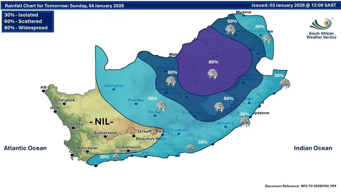 According to the SAWS, Johannesburg, Pretoria and Vereeniging are expected to be cloudy with widespread showers and thunderstorms. Mbombela, Mahikeng and Polokwane and Bloemfontein will experience scattered showers and thunderstorms, with the latter city also experiencing windy conditions.