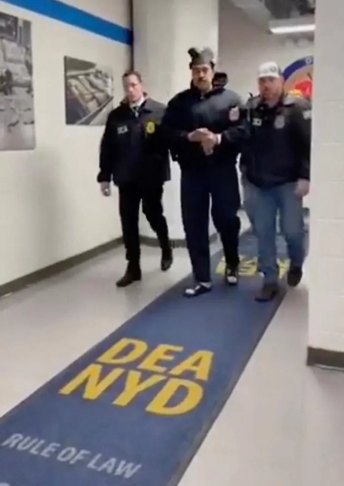 This screengrab taken from the X account of Rapid Response 47, the official White House rapid response account, shows Venezuelan President Nicolas Maduro (C) escorted by DEA agents inside the headquarters of the US Drug Enforcement Administration (DEA) in lower Manhattan, New York.