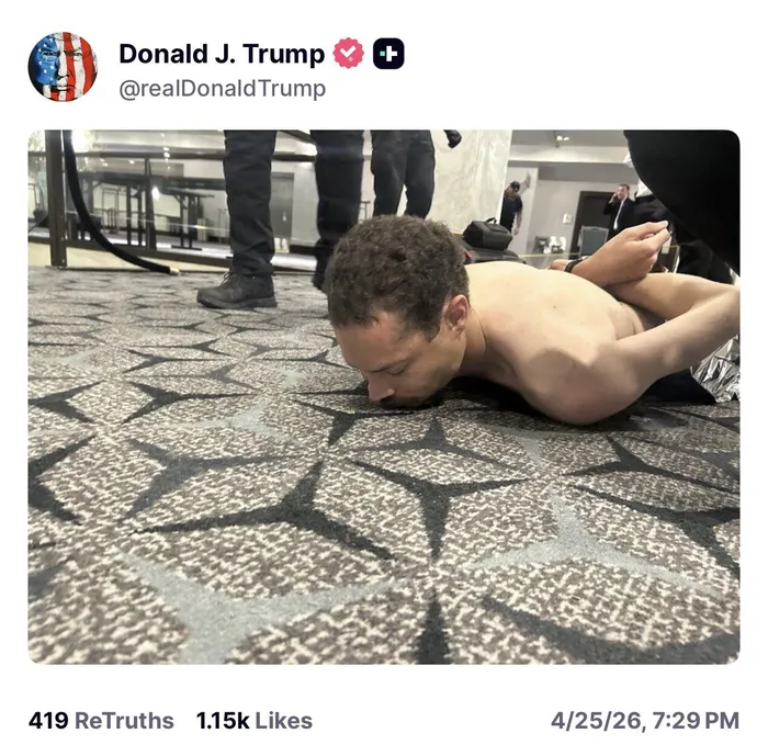 Hours after gunshots rang outside the ballroom where the glitzy White House Correspondents' Association dinner was being held on Saturday, Trump shared a photo of the suspect handcuffed and face down on the carpeted floor.