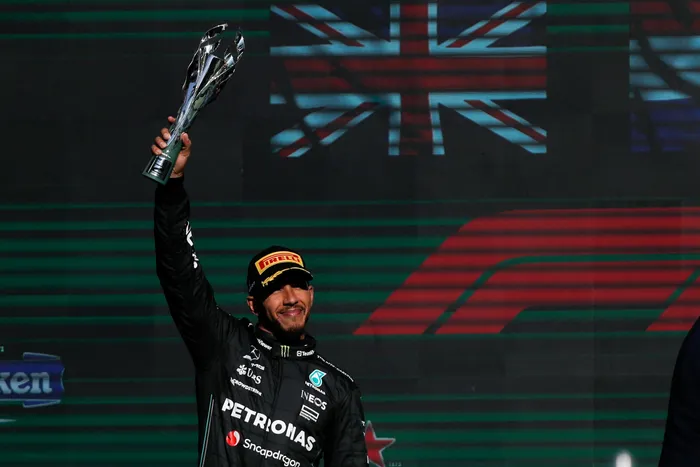 Lewis Hamilton holds his second place trophy in the air after the Mexico Grand Prix Lewis Hamilton finished second at the Mexico Grand Prix. Photo: Isaac Esquivel/EPA