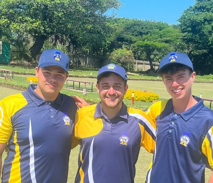 Port Natal Bowls junior skips Junior Skips Slayde Human (Queens BC), Keegan Bauristhene (Westville BC) and Troy McDowell (Umhlali CC) in their Optimum Apparel sponsored Port Natal Bowls kit. Photo: SUPPLIED
