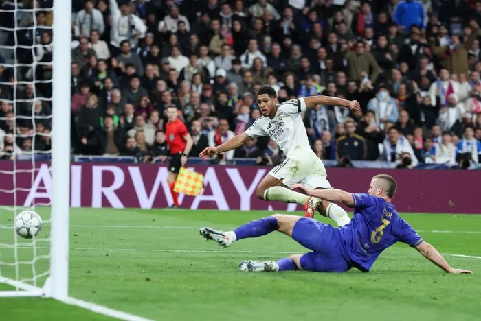Real Madrid's English midfielder #05 Jude Bellingham (L) scores his team's sixth goal past Monaco's English defender #03 Eric Dier during the UEFA Champions League league phase day 7 football match between Real Madrid CF and AS Monaco at Santiago Bernabeu Stadium in Madrid on January 20, 2026.