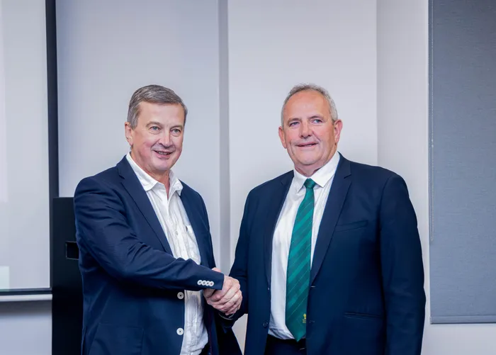 SA Rugby CEO Rian Oberholzer, left, has responded to rumours of an All Blacks swoop for Tony Brown. With a contract extension until 2031 now on the table, the Boks are determined to keep their attacking mastermind. Photo: Supplied