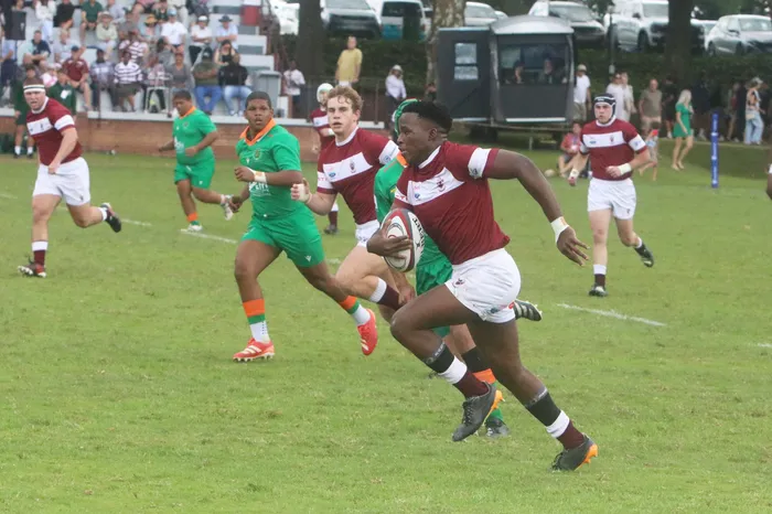 Kearsney captain and No 8 Nhalanhla Ndlovu heads for the tryline in his team's defeat of Rustenburg on Day One.