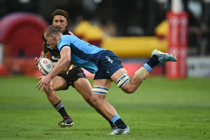 Cameron Hanekom of the Vodacom Bulls challenged by Jordan Hendrikse of the Sharks as the sides meet again in the United Rugby Championship. BackpagePix