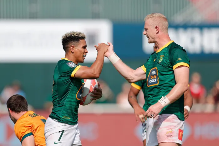 The Blitzboks’ Ronald Brown and Ryan Oosthuizen celebrate a try against Australia in the quarter-finals of the Dubai Sevens. The Blitzboks’ Ronald Brown and Ryan Oosthuizen celebrate a try against Australia in the quarter-finals of the Dubai Sevens. Picture: Mike Lee / KLC fotos for World Rugby