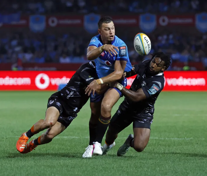 The Bulls' Springbok flyhalf Handre Pollatd gets the ball away during their URC SA derby against the Sharks.