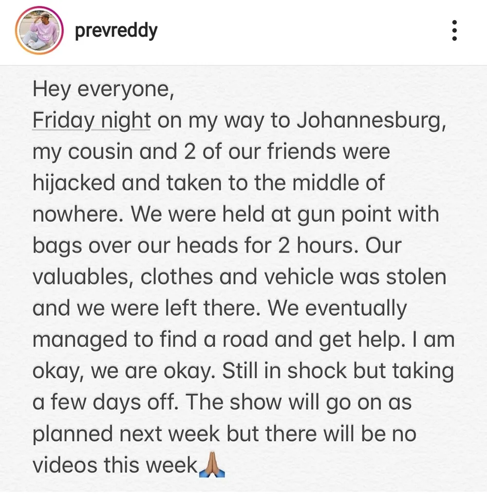 This is the message Prev Reddy posted on Instagram following the ordeal.