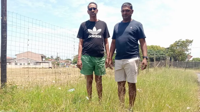 Brian Govindsamy, left, and Strini Pillay stand on the verge of a road in ward 68, where the grass has not been cut.