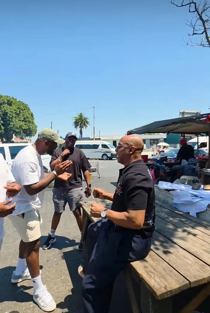 Siya Kolisi and Ian Wright enjoy conversation at a taxi rank in Cape Town.